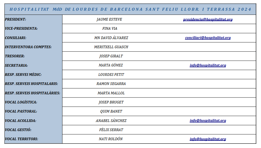 L’Hospitalitat de la Mare de Déu de Lourdes de Barcelona, Sant Feliu de Llobregat i Terrassa, és una associació que va néixer el 1910 per acompanyar a Lourdes a tots aquells que, per motius de salut o econòmics, no podien fer sols aquell llarg viatge.